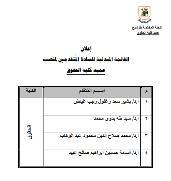 اعلنت جامعة القاهرة كشف بألاسماء المبدئية للسادة المتقدمين لمنصب عميد كلية الحقوق وفيما يلي صورة ضوئية من الكشف المعلن